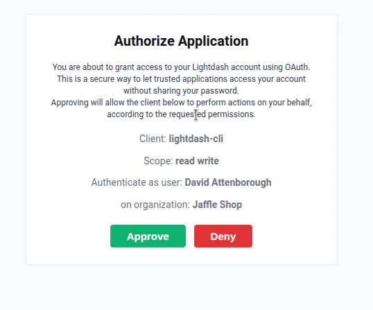 where {{ lightdash_domain }} is the subdomain for your Lightdash instance. For example, if you login at https://petey.lightdash.cloud, then you would type lightdash login petey to pop up a login window.