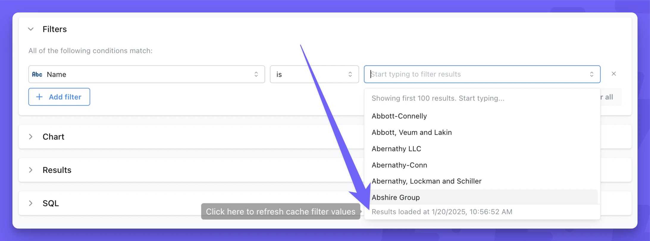 This type of caching works without any configuration for cloud users. You’ll see a message in your filter values that tells you when the cached filter values were loaded from (usually within the last day). If you want to refresh the filter values, you can click on that message and the values will be refreshed.