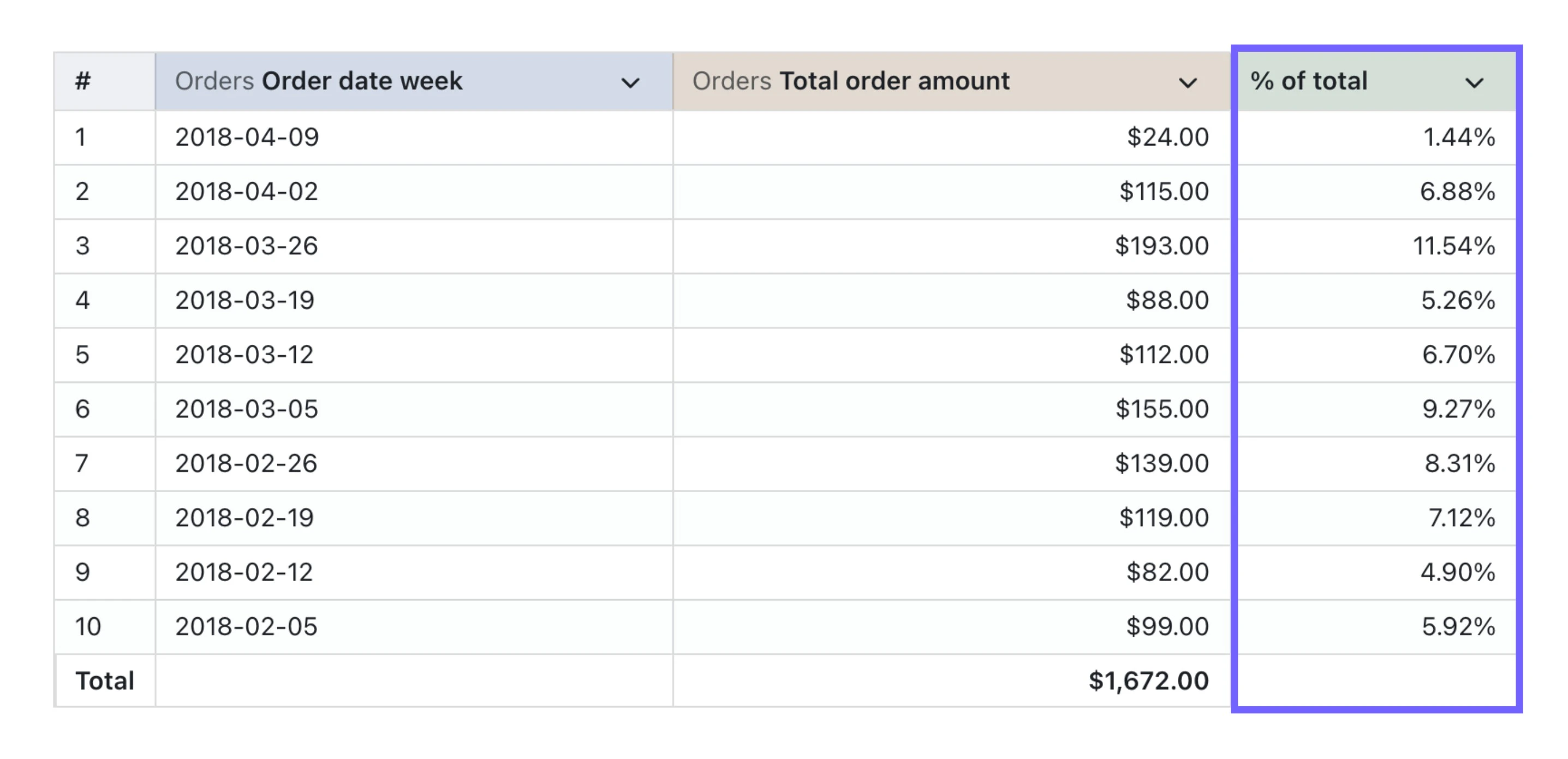 Just gimme the code! Here’s an example of a percent of the total column: