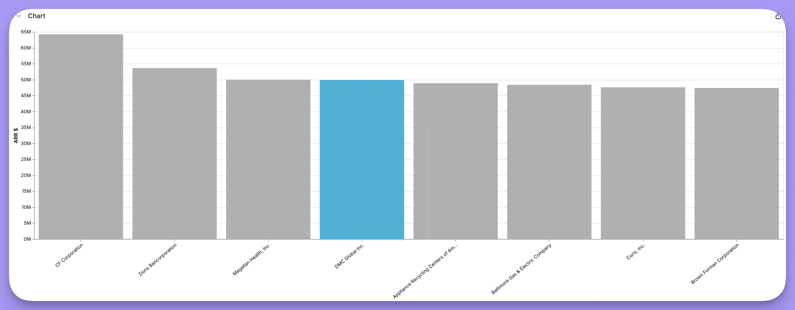 Highlighted bar charts are perfect for comparing a metric across categories while drawing attention to a specific item of interest, making it easy to see how one bar stands out from the rest. They’re ideal for emphasizing key accounts, top products, benchmark comparisons, or any scenario where you want to spotlight a particular category. This chart works best with a categorical dimension and a numeric metric. See a live demo of this chart on our demo site. The code below will give you a highlighted bar chart like this: