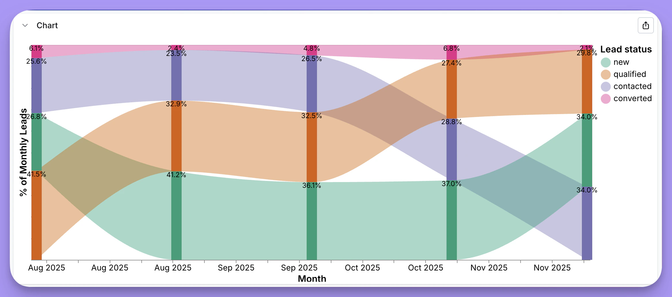 Use this chart when you want to show how parts of a whole change across categories or time and you want to visualize how individual segments flow from one stage to the next. It’s perfect for things like user cohorts, funnel stages, or survey responses over time. Any scenario where it’s helpful to track how groups move or shift between steps. See a live demo of this chart on our demo site. The config below will output a sankey-style bar chart with the standard Vega-Lite settings, like this: