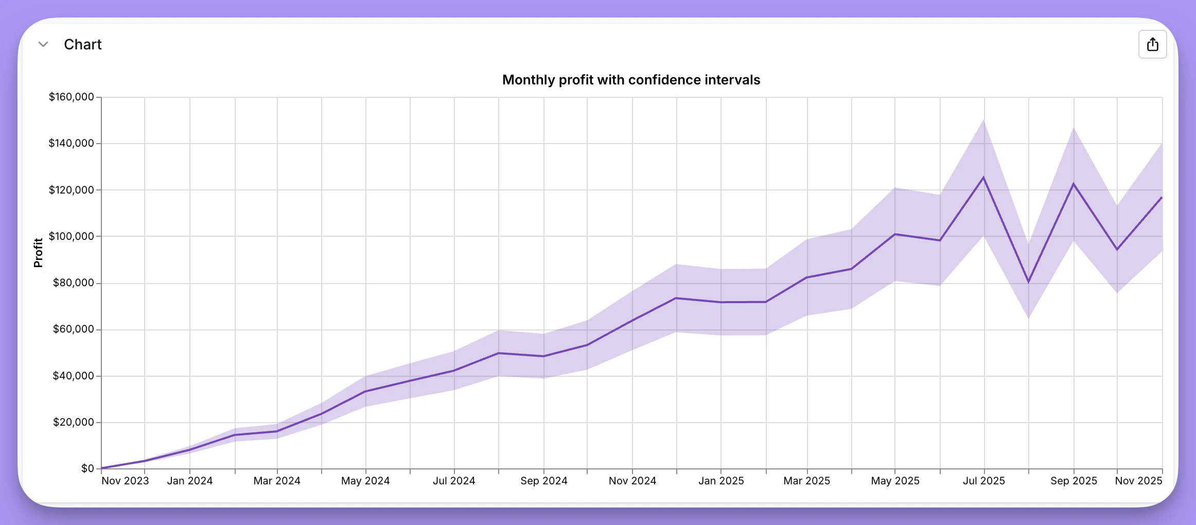 This chart works best with a date dimension on the x-axis and a numeric metric as the “Mean” with “Mean High” and “Mean Low” numeric values in your results. See a live demo of this chart on our demo site. The config below will output a line chart with confidence interval bands that looks like this: