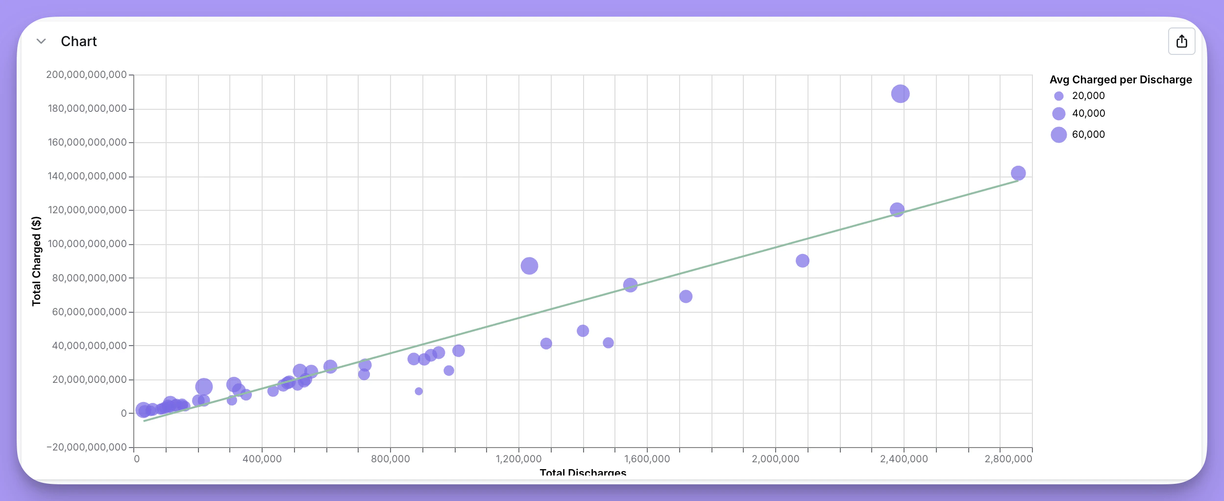 Bubble plots build on top of standard scatter plot visualizations, by allowing you to adjust the size of a given point based on the output of a field. Here’s one looking at some Healthcare data. This chart works best with string or date dimensions and a numeric metric for the y-axis and another numeric metric for the size. See a live demo of this chart on our demo site. The config below will output a bubble plot with the standard Vega-Lite settings, like this: