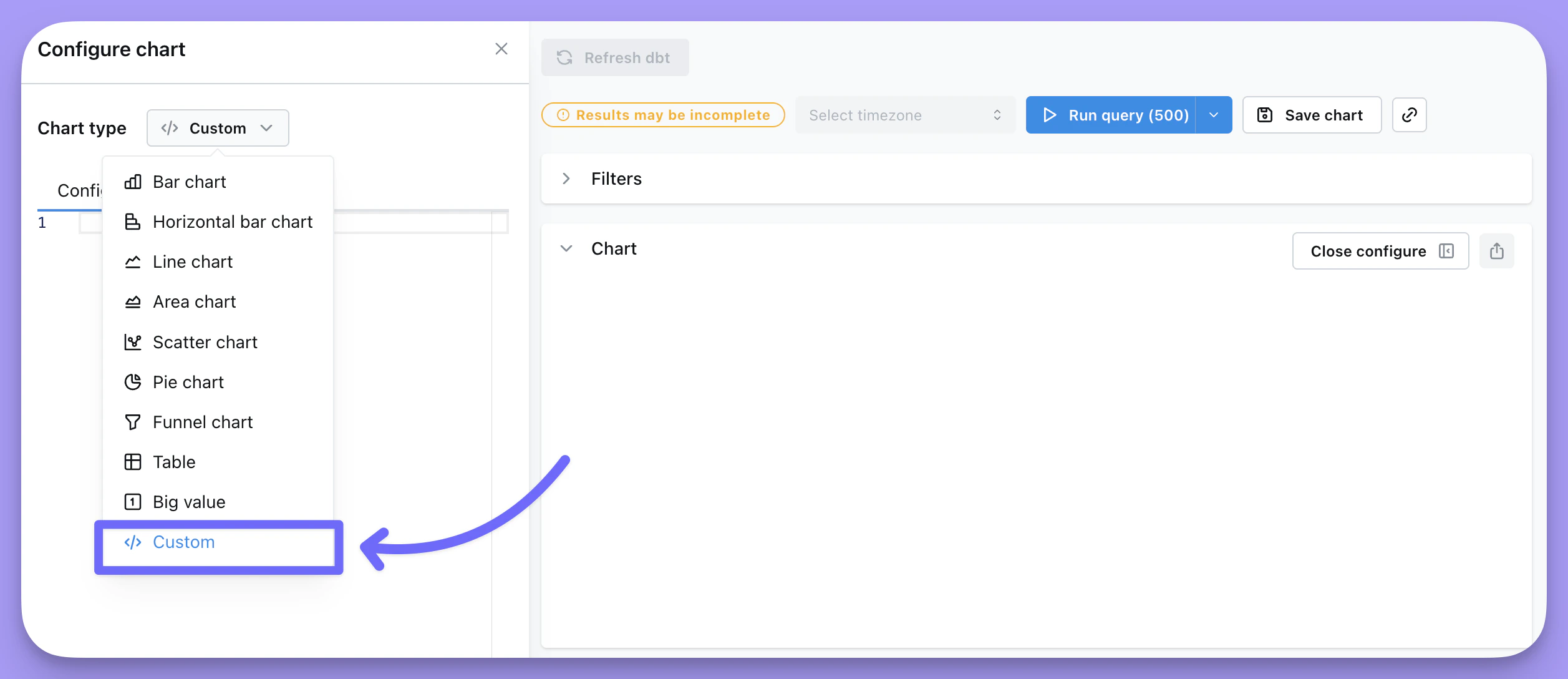 Return the data you need for your chart as normal using the Lightdash UI to select relevant dimensions and metrics.