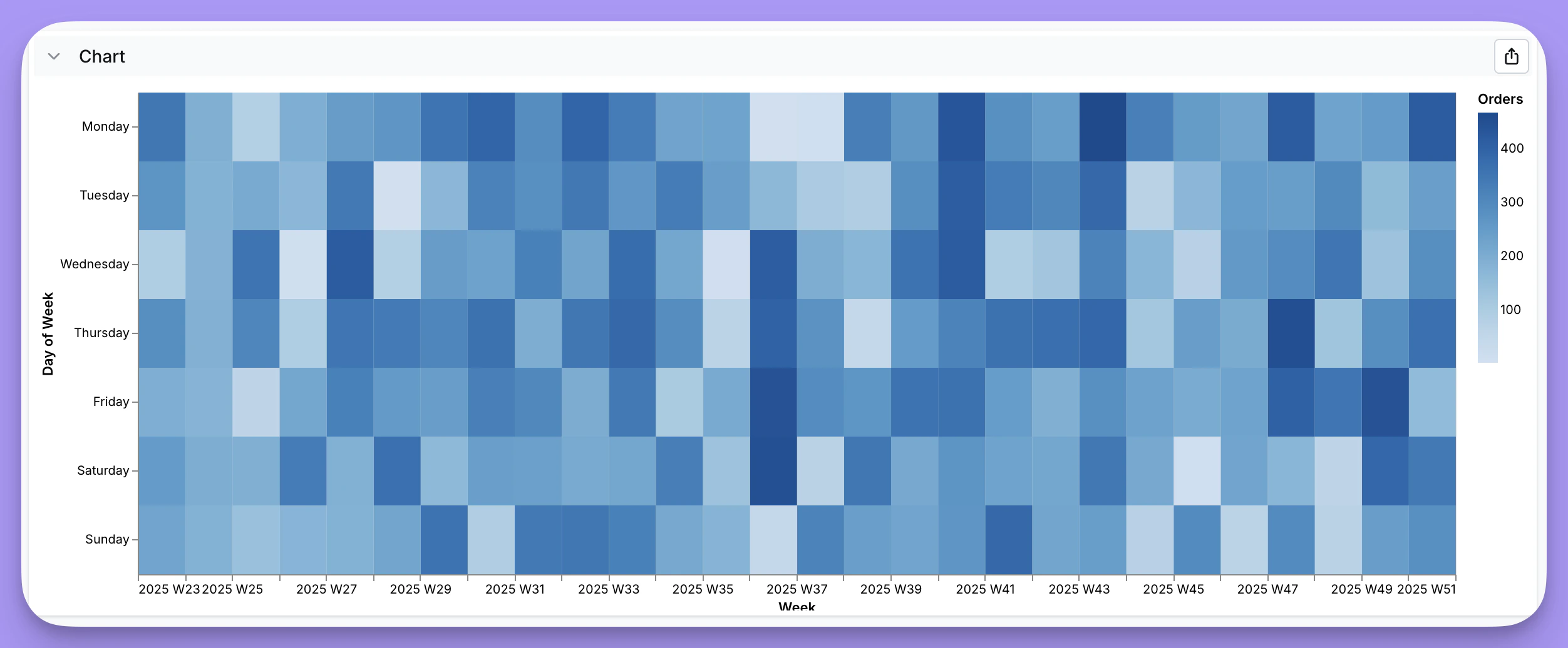 Heatmaps are ideal for visualizing patterns across two categorical or temporal dimensions, making it easy to spot trends, hotspots, or anomalies at a glance. They’re perfect for analyzing time-based patterns (like day of week vs. hour of day), comparing performance across categories, or identifying correlations in multi-dimensional data. This chart works best with string or date dimensions and a numeric metric as color. See a live demo of this chart on our demo site. In this example, the heatmap uses orders data to show patterns across order weeks (x-axis) and days of the week (y-axis), with color intensity representing the number of orders. The config below will output a heatmap with the standard Vega-Lite settings that looks like this: