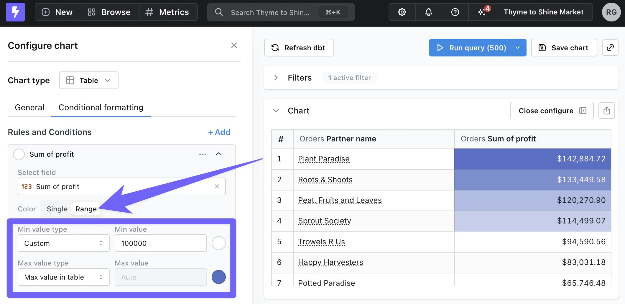 To use color ranges for your rules, select Range under Conditional Formatting. You can choose specific minimum and maximum values, or you can automatically set them based on the values in your results.