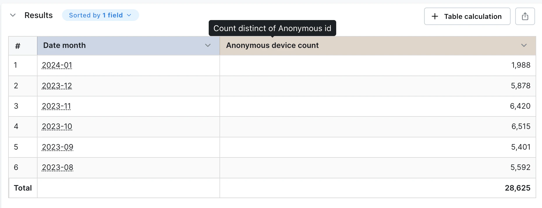 For example, if you count the distinct number of devices that viewed pages on our website each month, it would look something like this: